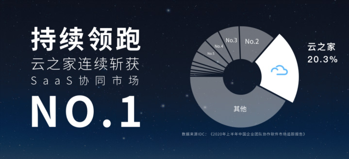 根據IDC近日發布的最新《2020年上半年中國企業團隊協作軟件市場追蹤報告》顯示:上半年云之家以 20.3%的份額再次蟬聯SaaS企業團隊協作市場第一名。據往年IDC數據顯示:云之家從2015年開始,連續3年在中大企業移動辦公市場占有率第一。從2018年至今,在SaaS企業團隊協作市場持續第一。