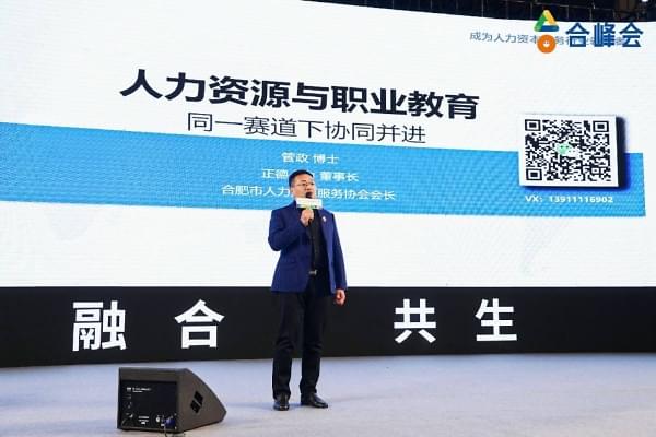 合肥市人力資源服務協會會長、正德人力董事長管政博士,做了《人力資源與職業教育:同一賽道下協同并進》的主題演講,首先從統領全局的高度,拋磚引玉式的引起參會者的強烈反響與共鳴。