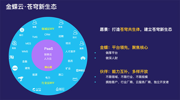 本屆蒼穹峰會上,金蝶發布了以蒼穹PaaS平臺為核心的生態戰略,秉承“平臺+生態”戰略,金蝶向全球征集基于蒼穹平臺的ISV合作伙伴、IaaS合作伙伴、咨詢合作伙伴,并攜手客戶共商、共建、共享生態體系。金蝶云·蒼穹始終關注吸引有行業競爭力的伙伴加入,目前蒼穹應用市場已入駐生態伙伴總數超過200家。蒼穹以分布式架構的彈性伸縮能力,大幅提升可靠性與性能;基于金蝶動態領域模型架構的低代碼開發平臺,可以讓ISV開發者效率提升500%以上;并提供豐富的微服務和AP,讓ISV伙伴可以最大限度利用平臺的開放能力。