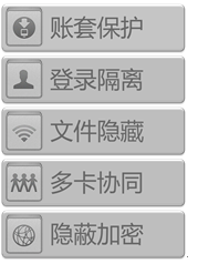 對企業的數據賬套進行隱藏和加密保護,實現登錄界面隱藏、數據庫管理界面隱藏、數據庫實體文件隱藏和加密保護,在沒有UnionKey的情況下無法進行查詢及操作數據賬套;在業務系統的登錄界面對保護的賬套實現不同的操作員使用不同的賬套,相互之間無法查看被隔離的賬套;受保護的業務系統賬套文件和文檔完全加密隱藏保護,在Windows中無法找到該文件;通過配置參數,實現多臺電腦使用多個硬件卡一起協同保護一個或多個賬套;用多卡協同保護時任何一個硬件卡沒有聯機時將無法打開賬套,實現隱蔽式的加密保護功能。